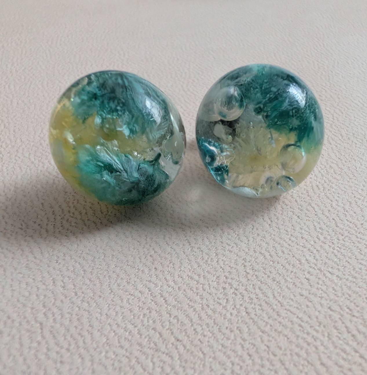 緑と黄色のドライフラワーを入れているお花のピアスです。