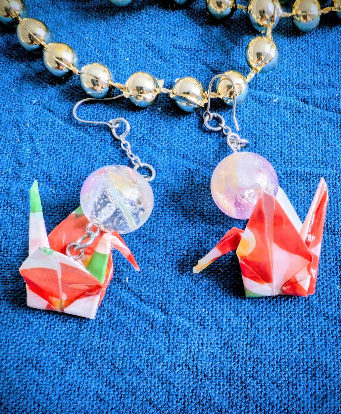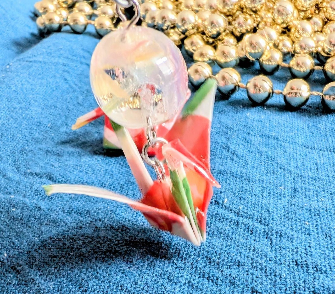 折り紙のつるをレジンでコーティングして、丸いレジンパーツと組み合わせてみました。